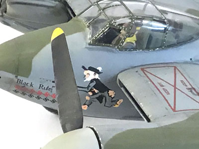 Souvent appelée la « Wooden Wonder » (la merveille en bois) , la conception de Mosquito a été presque abandonnée sur la table à dessin dans un brouillard de scepticisme. Cependant, lorsqu'un premier prototype a effectué son vol initial, les chiffres de performance et la facilité de manipulation ont tellement étonné le ministère de l'Air que l’avion, fabriqué presque entièrement en bois, a été précipitée en production. Le DeHavilland Mosquito s'est avéré être l'un des avions les plus versatiles et les plus utilisés de la Seconde Guerre mondiale. Il était capable d'une longue portée et d'une longue durée de vol, était très maniable et rapide, assez rapide en fait qu’il pouvait, pendant la majeure partie de la guerre, éviter les combattants ennemis en les distançant simplement avec sa vitesse maximale de près de 400 mph ( ou mieux dans certaines versions.) En même temps, le «Mossy» avait un coup de frappe formidable. Il était armé d'une batterie de nez composée de quatre mitrailleuses calibre 30 et de quatre canons de 20 mm. Le FB VI pouvait transporter deux bombes de 500 lb et pouvait également être armé de missiles qui étaient souvent utilisés dans des opérations anti-navigation. Comme bombardier non armé avec un équipage de deux personnes, il était capable de transporter une plus grande charge de bombes plus loin que le célèbre B-17 Flying Fortress à 4 moteurs. C'était l'avion de photo reconnaissance le plus productif de la guerre et était considéré comme l'avion d’attaque à très basse altitude le plus efficace. Ma maquette représente un Mosquito de l'ARC appartenait au 418e Escadron, « City of Edmonton Sqn », et était piloté par R.A. Bob Kipp basé à Middle Wallop, Angleterre, août 1945. |