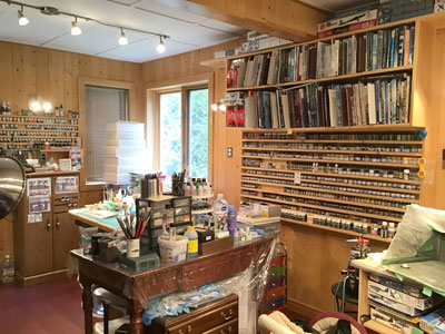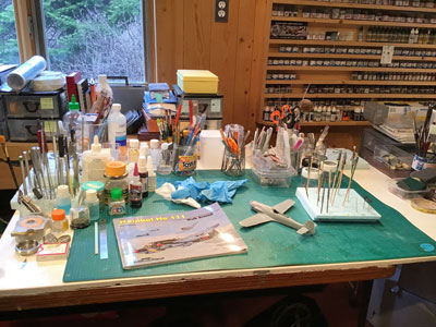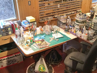Voici quelques clichés pour donner une idée de l'espace de travail que j'ai aménagé pour construire mes modèles. Étant donné que les constructions peuvent durer des semaines, voire des mois, il est important d'avoir un espace dédié au travail. Il est particulièrement important d'avoir l'installation appropriée pour les travaux de peinture. Bien que de nombreux produits de peinture ne soient pas toxiques, certains peuvent être particulièrement dangereux s'ils ne sont pas traités de manière responsable. Un bon masque, un système de filtrage et une ventilation sont essentiels. |
